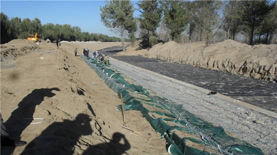 左堤加高:樁號ZD6+918~ZD9+235,填筑質量標準:粘性土壓實度≥92%,無粘性土相對密度≥0.65。填筑完成后進行麻網椰纖植生毯鋪設。