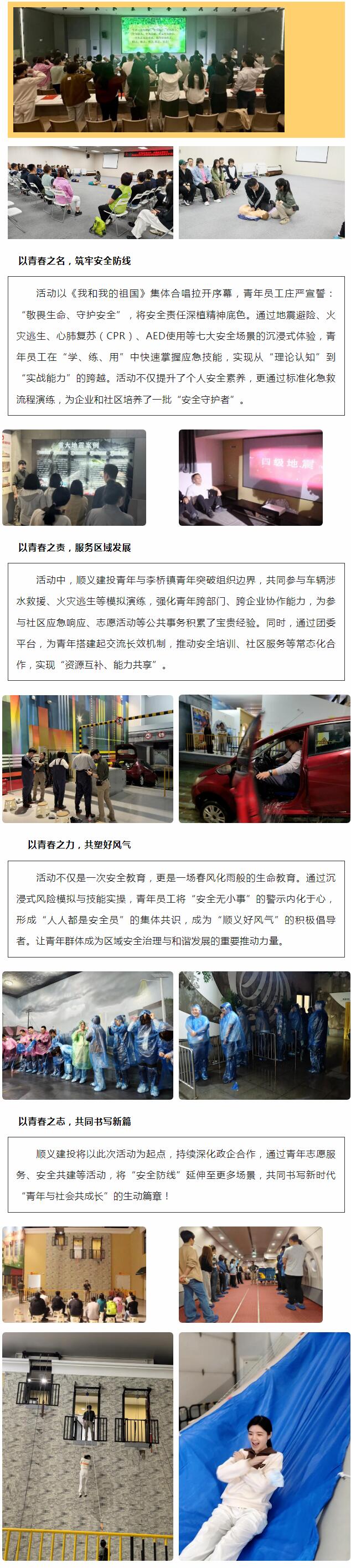 五四青年節(jié)到來之際,北京順義建設(shè)投資服務(wù)有限公司(簡稱“順義建投”)聯(lián)合李橋鎮(zhèn)政府,以“青年攜手安全行、共塑順義好風(fēng)氣”為主題,在北京公共安全體驗(yàn)館舉辦了一場別開生面的沉浸式安全教育活動。50余名青年員工通過“識險避險、自救互救”實(shí)戰(zhàn)演練,將五四精神轉(zhuǎn)化為守護(hù)生命的行動力,為順義區(qū)安全防線建設(shè)注入青春動能。