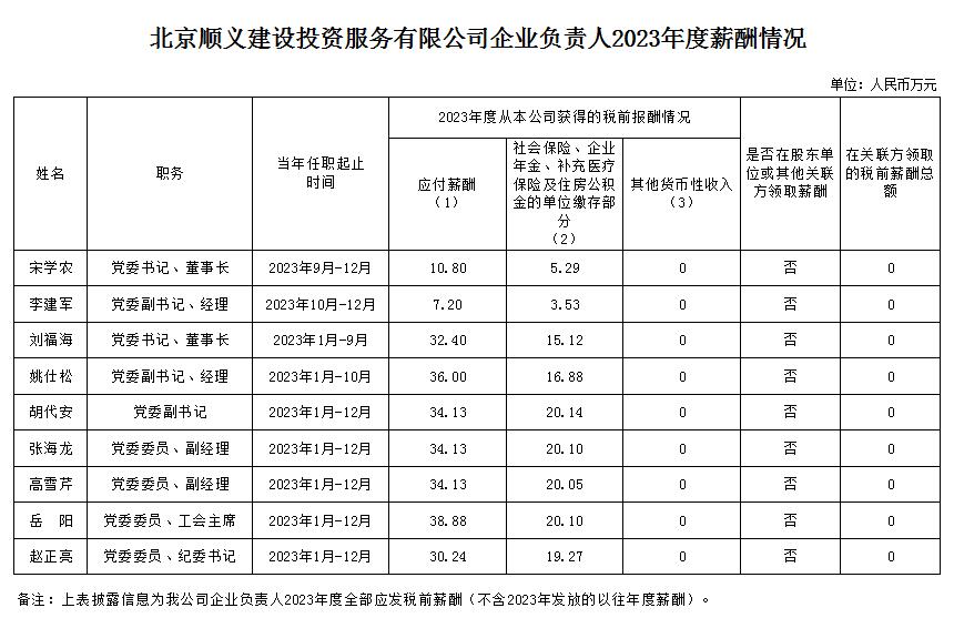 北京順義建設投資服務有限公司企業負責人2023年度薪酬信息披露