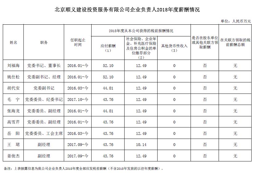 北京順義建設投資服務有限公司企業負責人2018年度薪酬信息披露