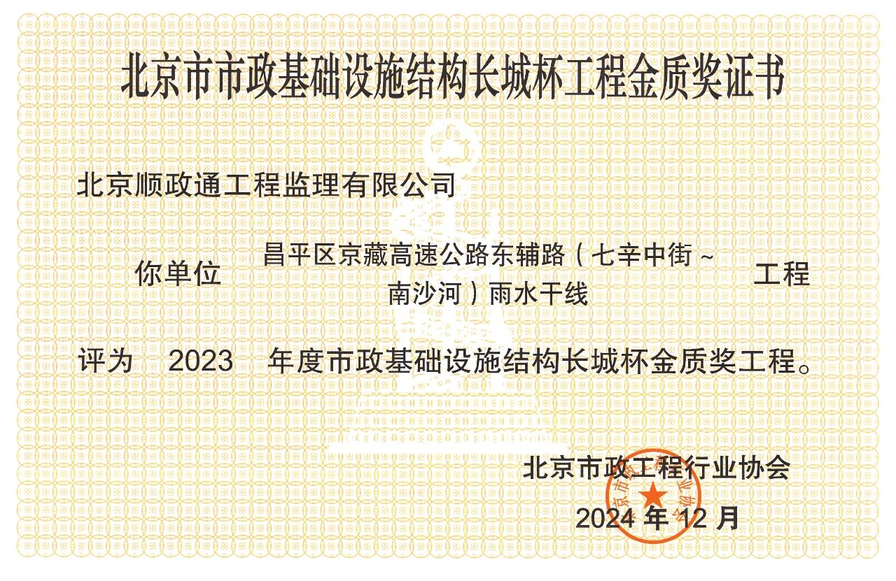 順政通監理公司喜獲北京市市政基礎設施工程結構長城杯金質獎