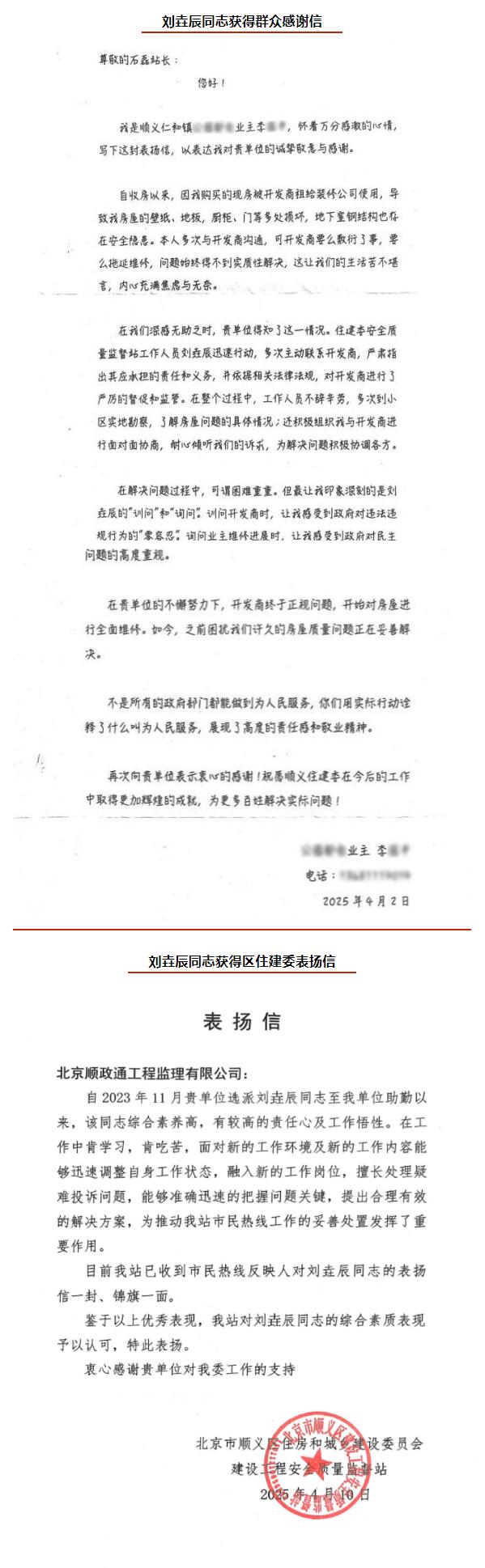 劉垚辰同志在服務(wù)過(guò)程中,始終以駐勤工作為中心、以切實(shí)解決群眾需求為導(dǎo)向,變“被動(dòng)”為“主動(dòng)”,充分發(fā)揮在監(jiān)理方面的專(zhuān)業(yè)所長(zhǎng),以過(guò)硬的業(yè)務(wù)知識(shí),創(chuàng)新工作方式,主動(dòng)傾聽(tīng)群眾訴求,加班加點(diǎn)做好協(xié)調(diào),接連獲得群眾致謝錦旗及感謝信,生動(dòng)詮釋了"民有所呼,我必有應(yīng)"的服務(wù)擔(dān)當(dāng),為助力質(zhì)監(jiān)站相應(yīng)工作的開(kāi)展貢獻(xiàn)了重要力量,充分展示了順政通員工愛(ài)崗敬業(yè)的優(yōu)良品質(zhì),彰顯了順政通公司一貫堅(jiān)守的嚴(yán)謹(jǐn)務(wù)實(shí)、精益求精的工作作風(fēng)。